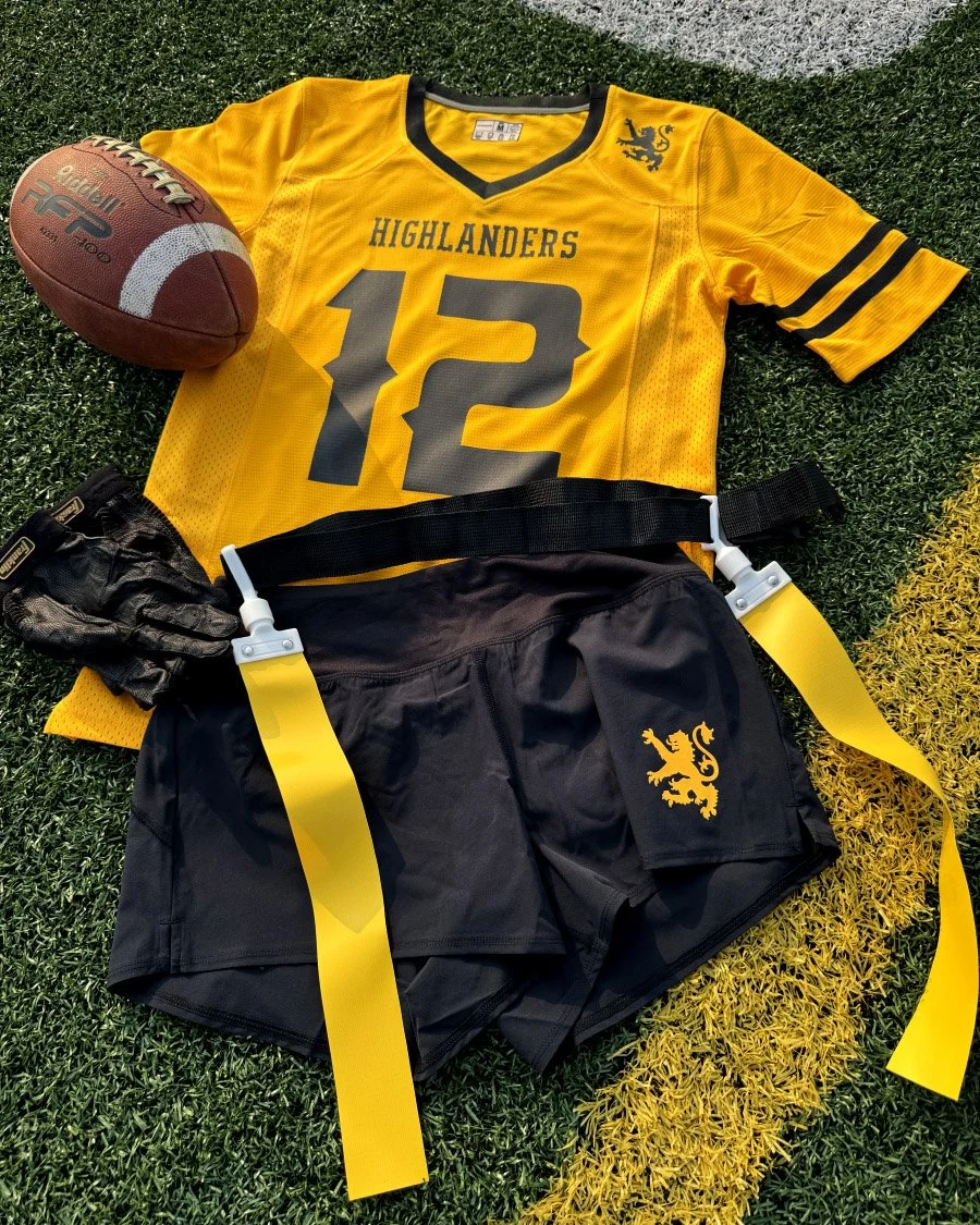 Youth flag football teams are upgrading their look with full kits, jerseys, shorts, and accessories that feel cohesive and custom. On this Highlanders set, a one-color Howard MP print (done in both Black and Athletic Gold ink) uses a color wash to get the most out of the transfer order.