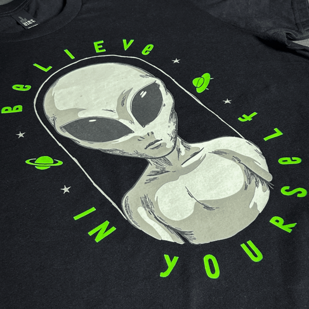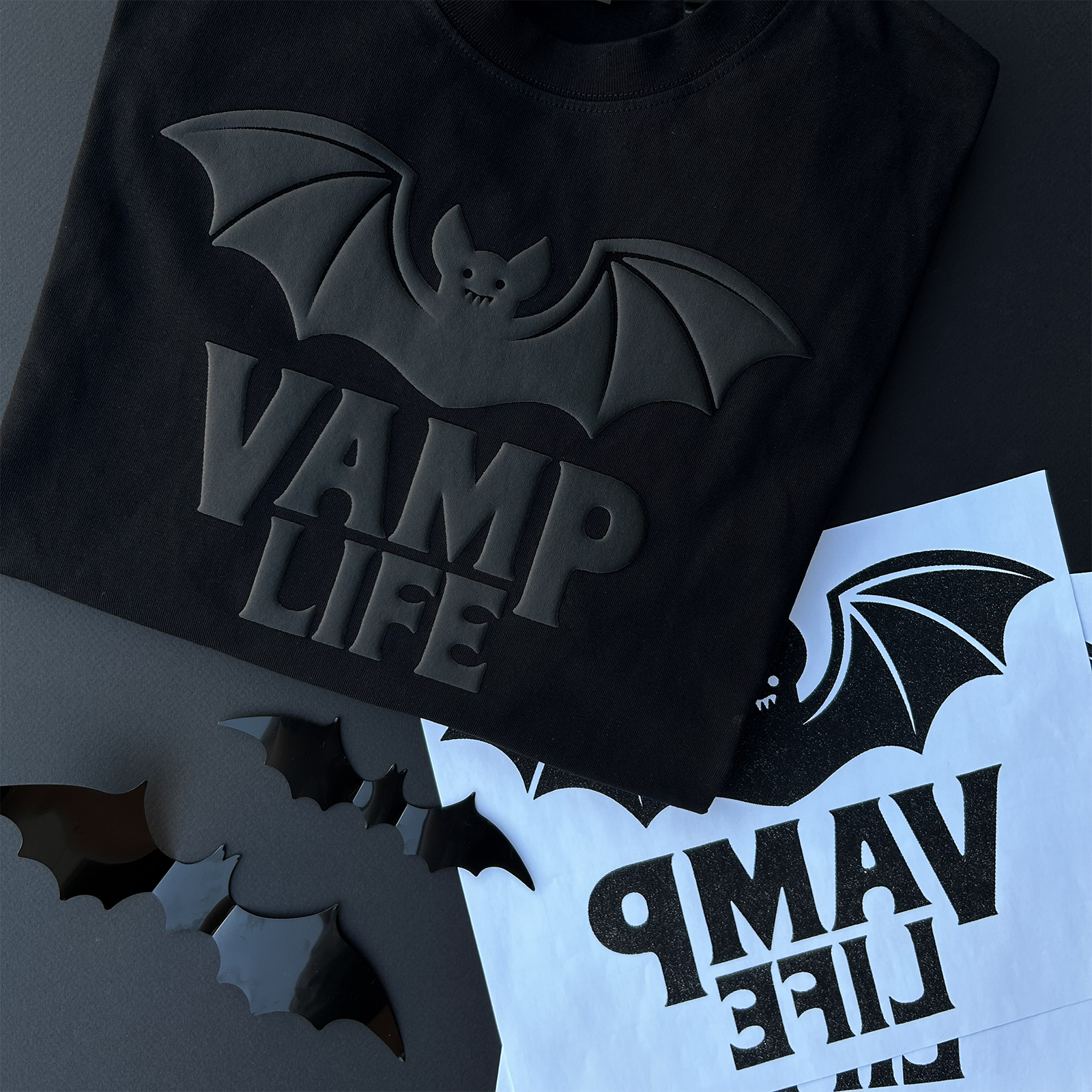 Tone-on-tone Puff printing is all about subtle drama, and it’s perfect for Halloween. We created our Vamp Life shirt with black Puff ink on a black tee, letting the design rise right off the fabric for a luxe, dimensional look. The shadowy effect works beautifully for gothic-inspired apparel and shows how Puff can make a monochromatic design come alive without needing a pop of color.